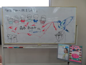講演会開始前、絵の得意な生徒がホワイトボードに講演会のタイトルやイラストを描いてくれました!