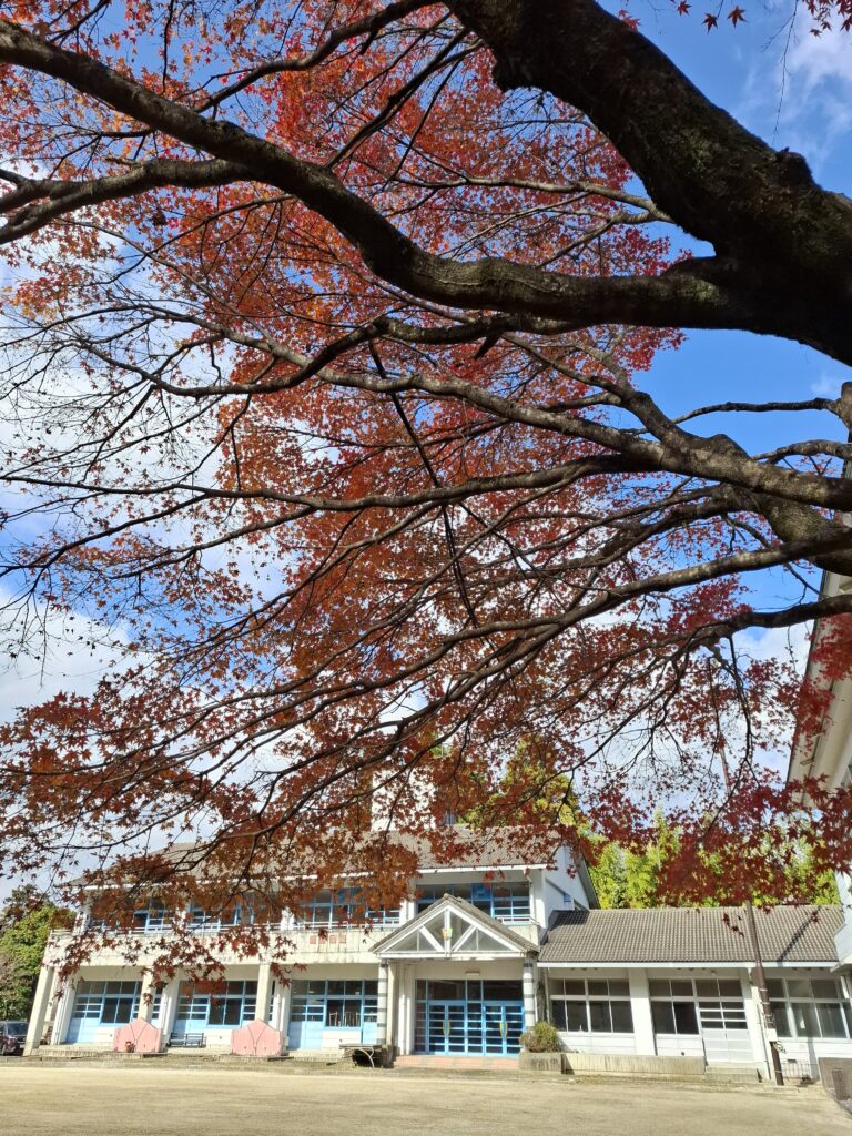 美しい景色と目丸の校舎でした。グランドにはまさに真っ赤な紅葉。
