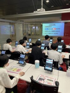 これは、仮想の資金を使って、実際の株価データに基づいた模擬株式取引を体験できるシミュレーションゲームです。生徒たちはタブレットを片手に、提示されるニュースや企業の情報を分析し、どの株を買うか、いつ売るかを真剣に議論し合いました。