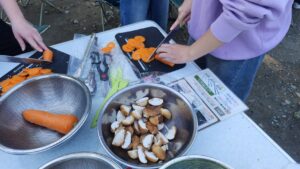 皆さんと協力して火をおこしたり具材を焼いたりする中で、