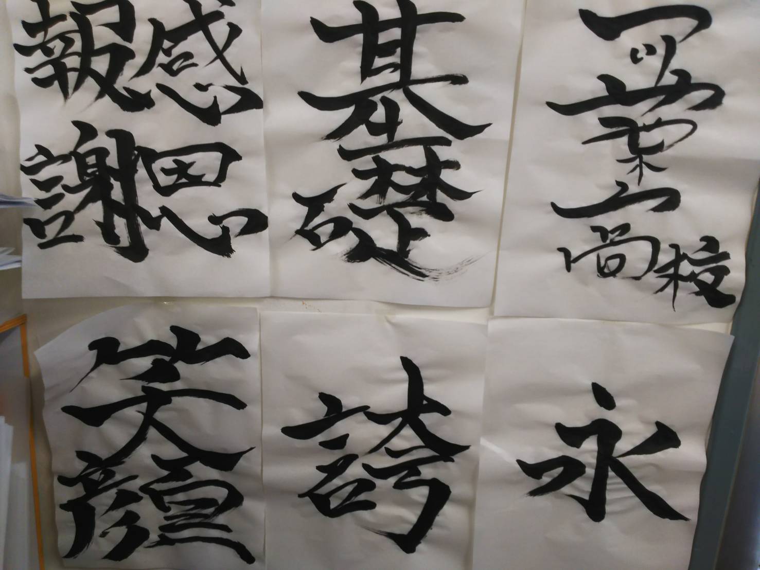 書道のレポートをしている生徒がいると、小倉キャンパスは芸術家が大量発生する傾向があります。人が筆を動かしていると、自分もやりたくなるんでしょうね~(私もその傾向がありますが)。筆は、力の入れ具合によって、太くも細くも書けます。墨も自分で磨れば、濃淡を工夫することができますね。私は墨を磨る時間が結構好きです。じっくりと磨っているとなんとなく心が落ち着きます。心を落ち着けて筆を手にすると、気持ちよく筆を走らせることができますね。生徒の皆さんも、また時間があるときは墨を磨るところから始めてみてください。