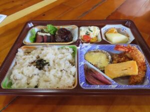 山都町で採れた野菜の炊き込みご飯やサラダにグラタン,猪や鹿の肉で作ったハンバーグやステーキなど,とっても美味しいお弁当でした。